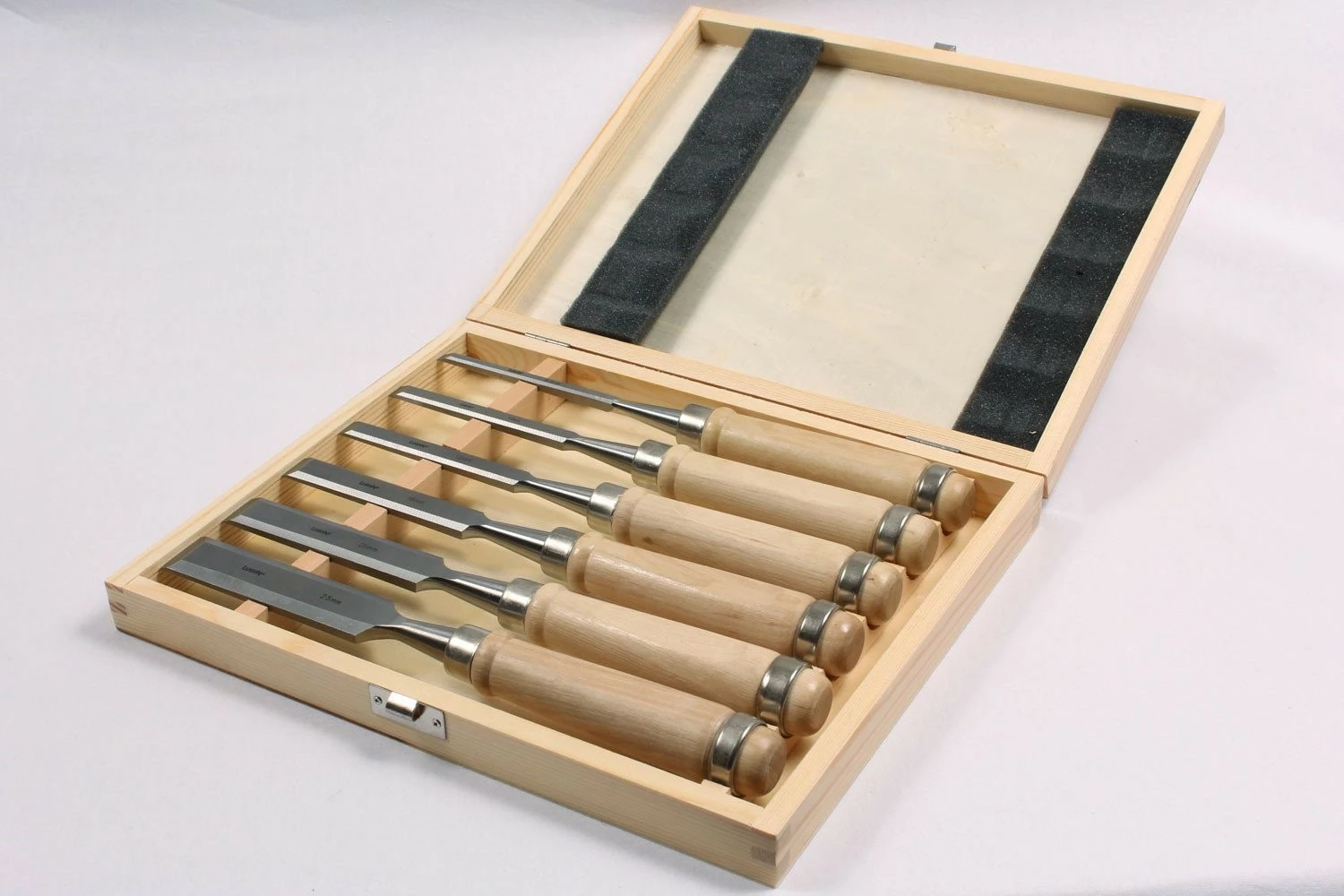 These general-purpose chisels have standard CRV (Chrome Vanadium) steel blades found in most normal chisels in major brands in hardware stores that are up to twice the price. They have a standard bevel edge blade design along with English Hornbeam handles and hoops so they can be used with a mallet for general purpose work. This set comes in a wooden presentation box with size 6mm, 10mm, 12mm, 16mm, 20mm and 25mm chisels.