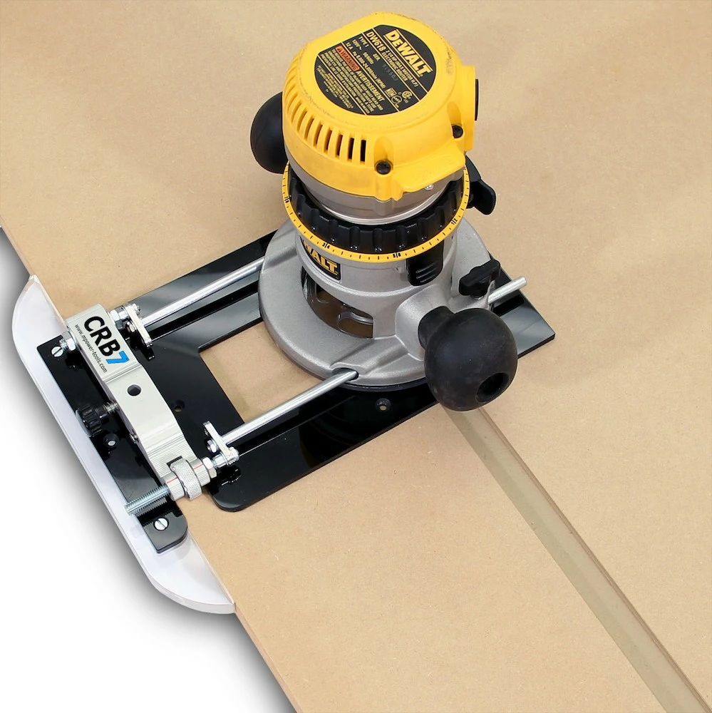 - Improved control when grooving in-board with a router – One of the most common accessories to the standard woodworking router is the Parallel Edge Guide. The usual design of Edge guide is large, cumbersome, time consuming to set up and has a disappointingly small range to penetrate in-board from the edge. Many router users prefer not to take the time to set up an edge guide on their router but rather go to the trouble of using a clamp guide. However the CRB7 Edge Guide is a considerable time saver when batch routing many boards with the same dado or groove dimensions.