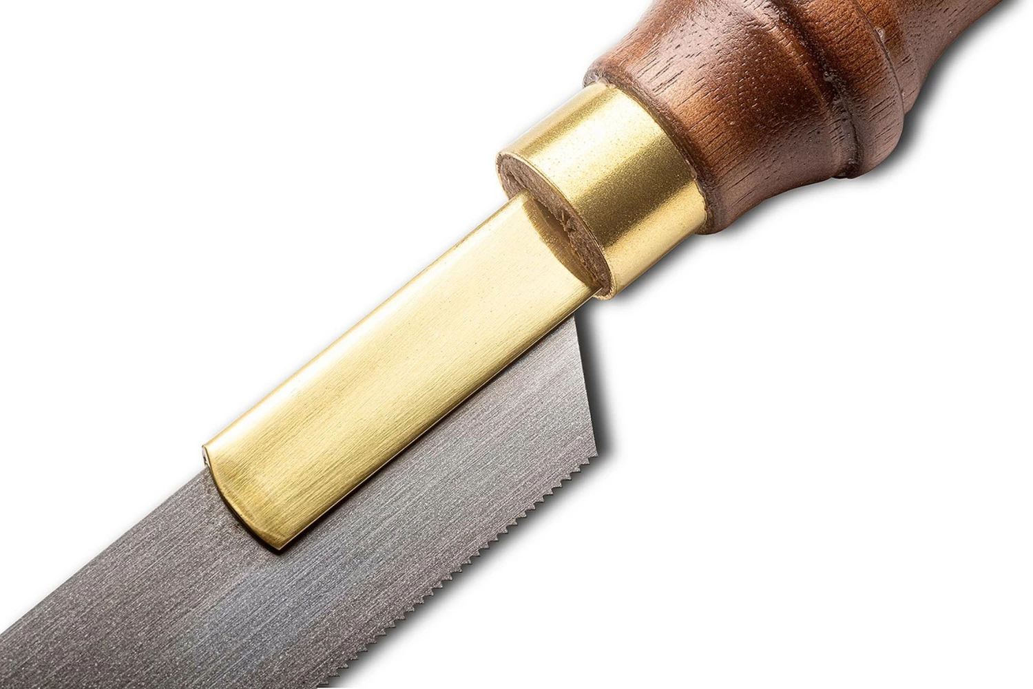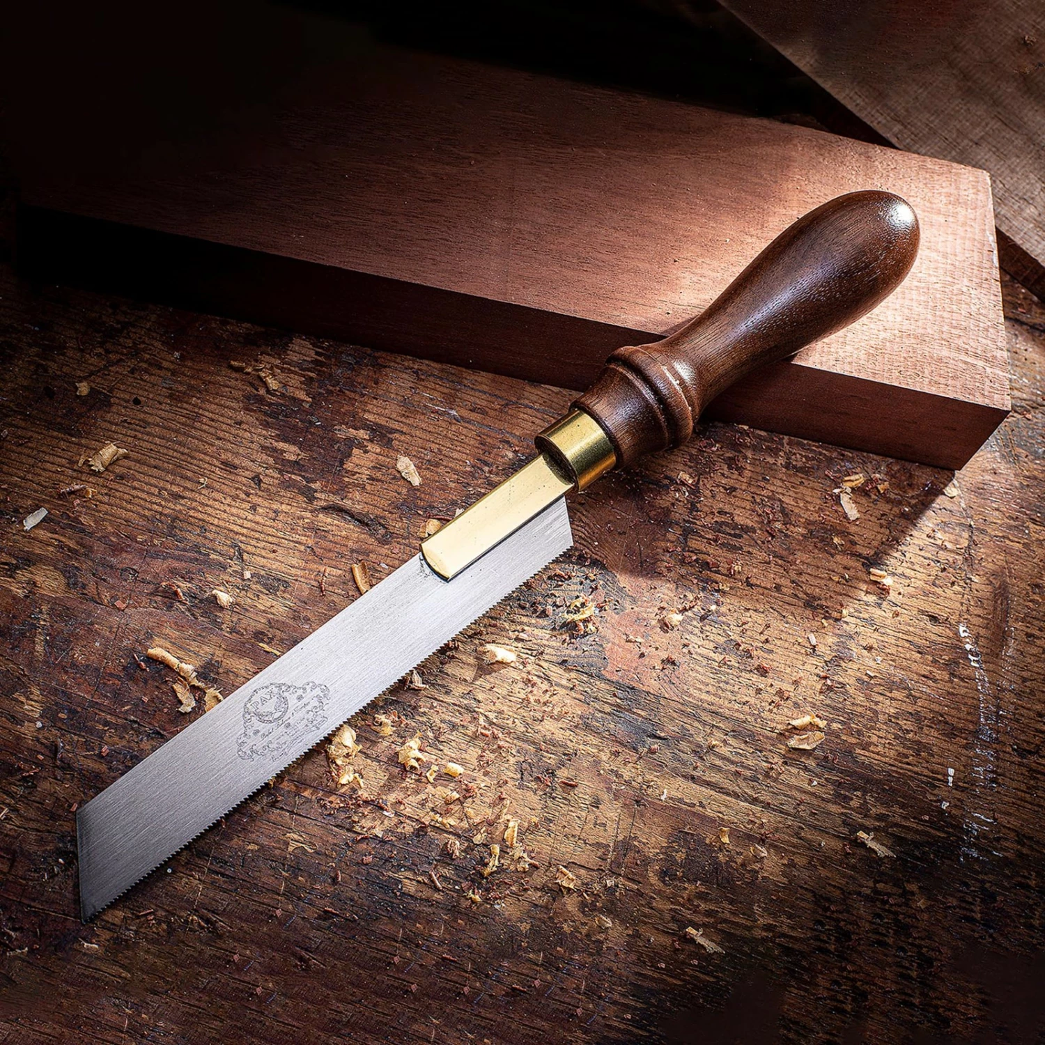 Made from high quality carbon steel, the blade is hand sharpened. To match such craftsmanship this blade is matched with a mirror polished, heavy folded brass back which offers the perfect balance and tension to the saw and the handle is made from walnut with brass ferrule.