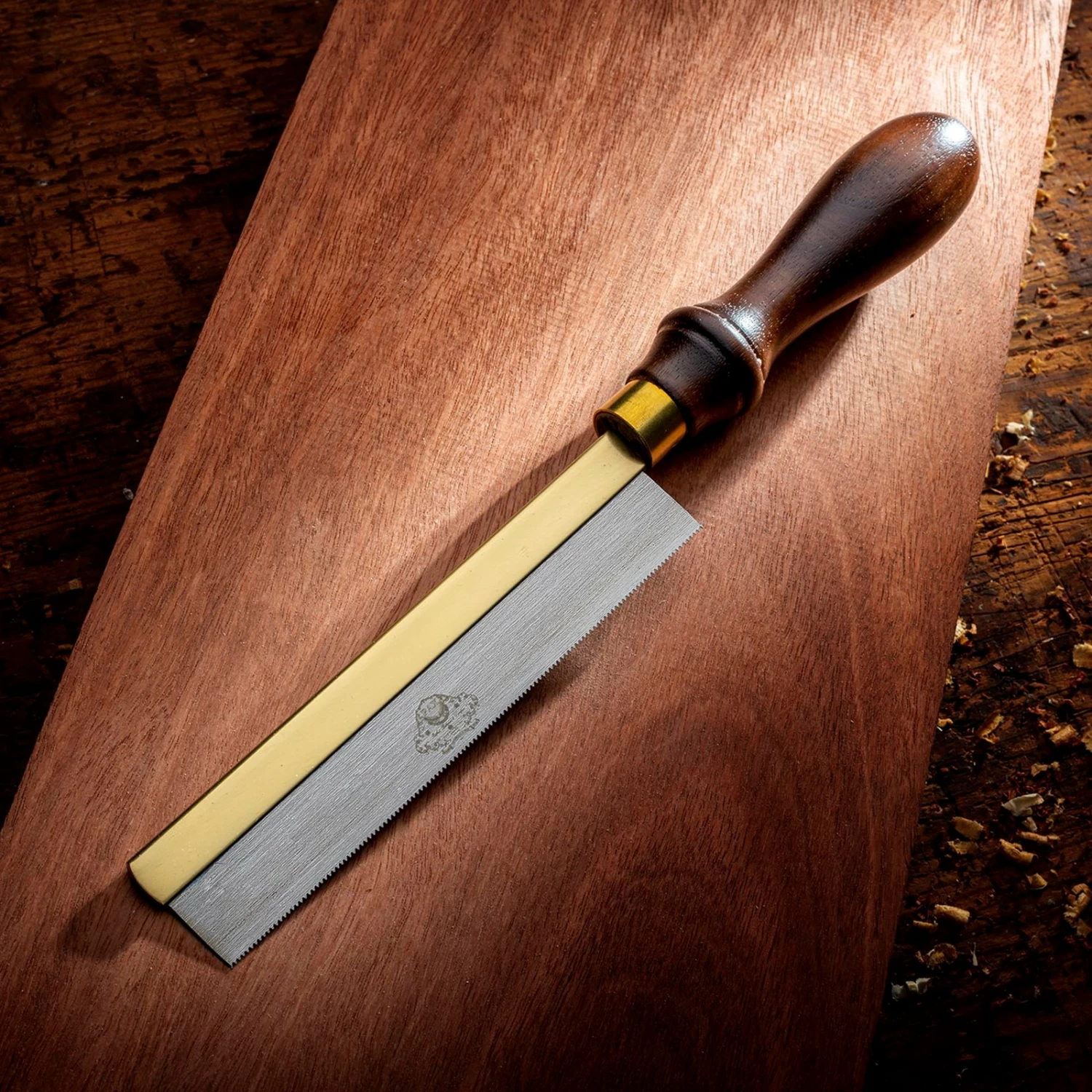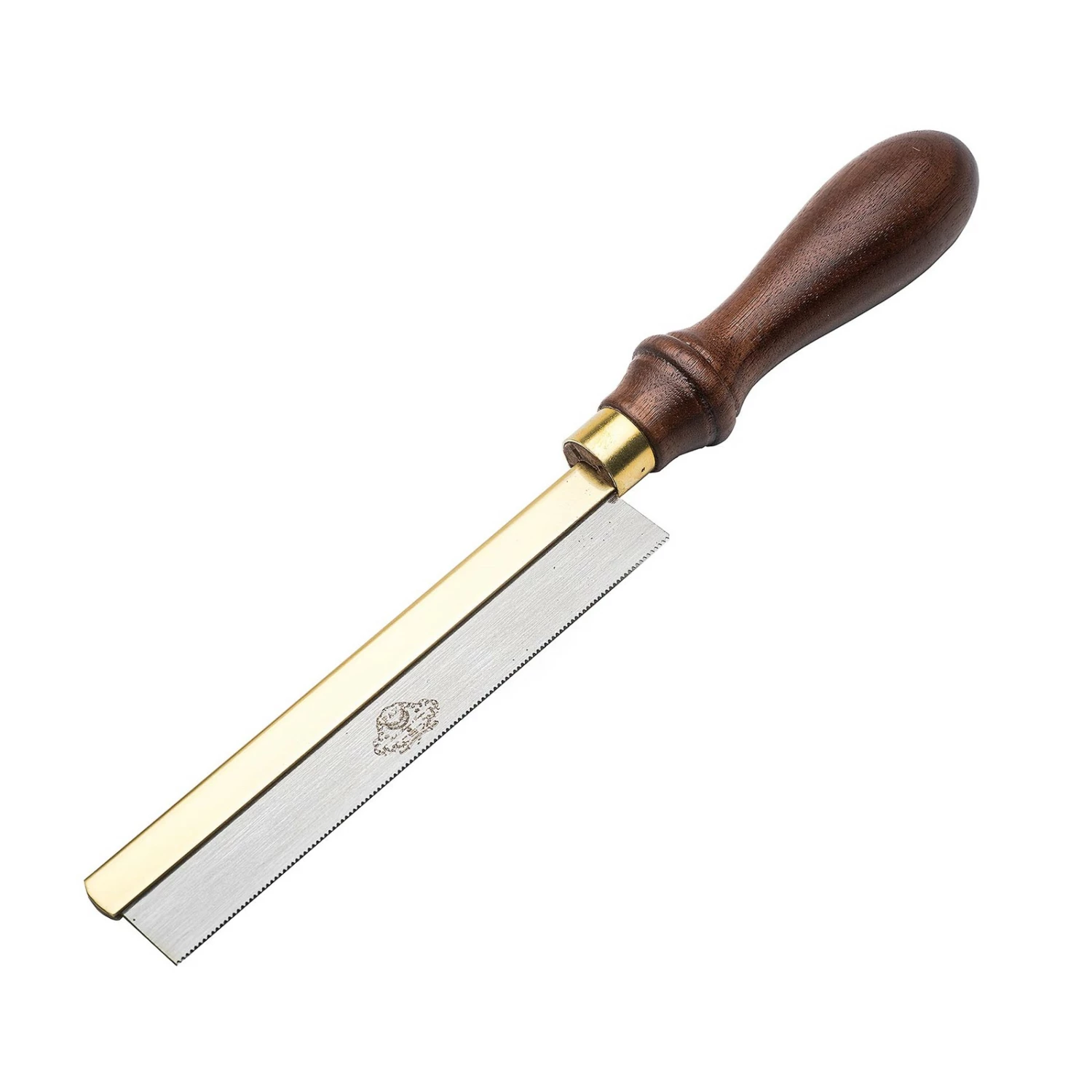 Made from high quality carbon steel, the blade is hand sharpened. To match such craftsmanship this blade is matched with a mirror polished, heavy folded brass back which offers the perfect balance and tension to the saw and the handle is made from walnut with brass ferrule.
