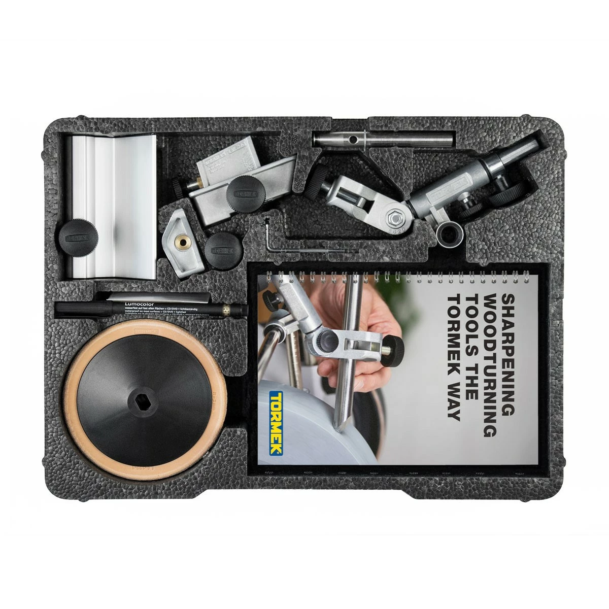 This kit contains everything you need to shape and sharpen all your turning tools, including two patented jigs (works like three!), a radiused leather honing wheel, a serious instruction book, the appreciated Turning Tool Setter and the Tormek Case to store all your jigs.