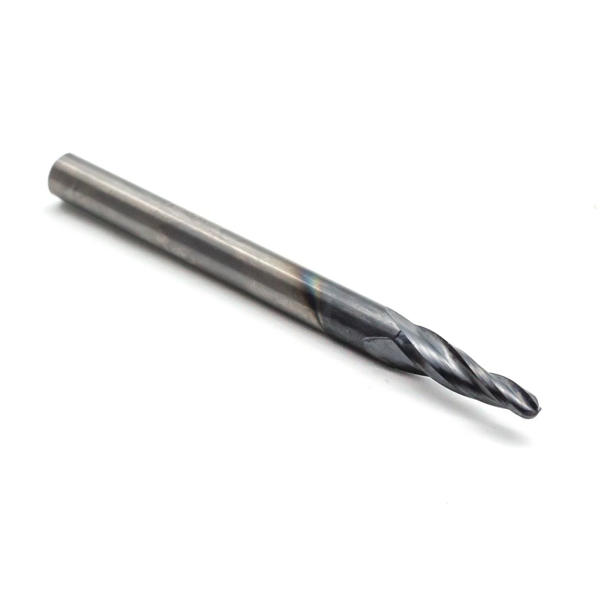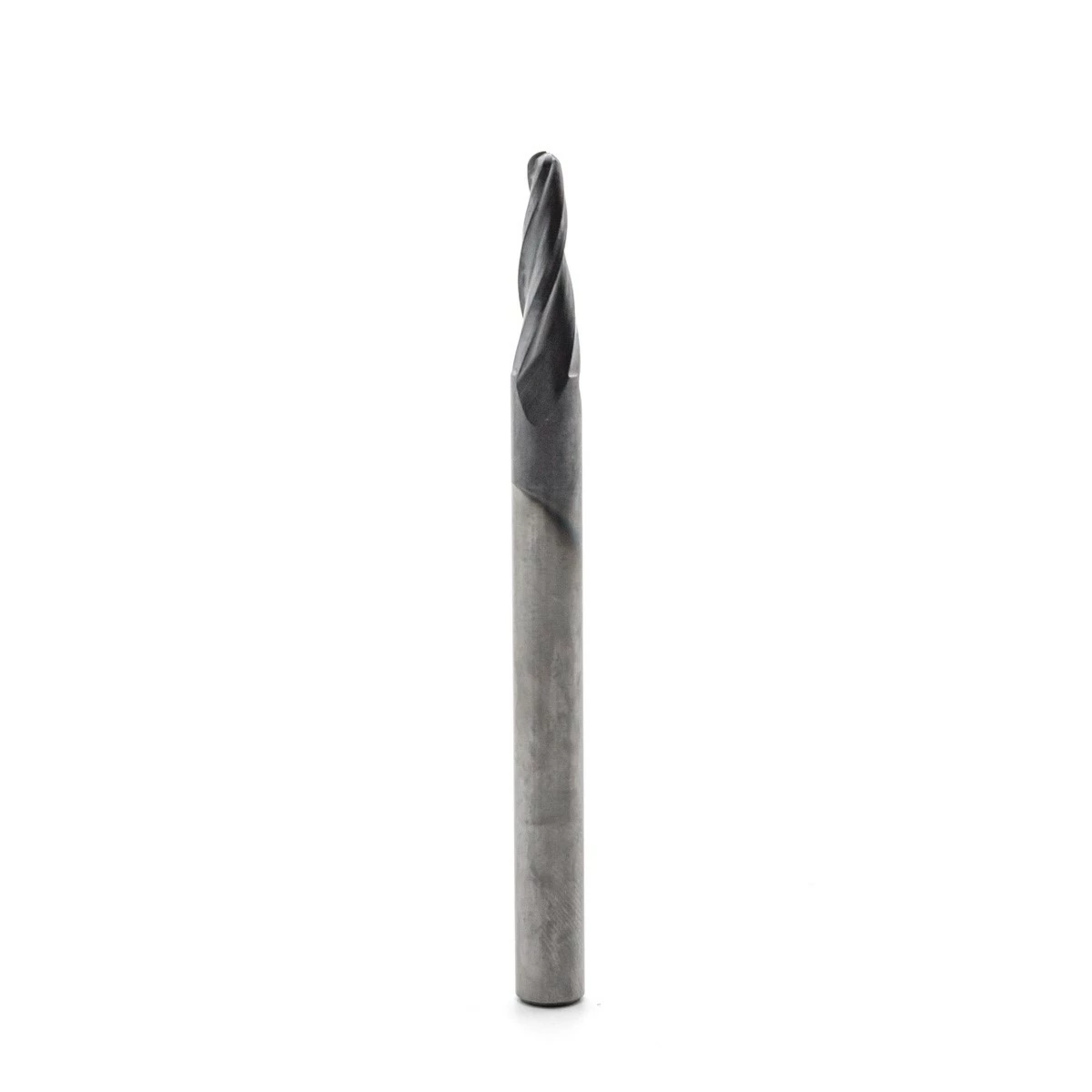 This CNC router bit is designed for 2D and 3D CNC profiling and carving in plastic, aluminium & wood. The high-shear ball nose tips cut smooth 2D and 3D contours with reduced stepping while the proprietary ZrN coating (applied by the physical vapour deposition coating process) provides high resistance to wear, sharper cutting edges, extended tool life and less friction and heat build-up. It can tolerate RPM’s up to 60,000 RPM. A directed air-blast to keep chips away along with cooling the tool is advised.