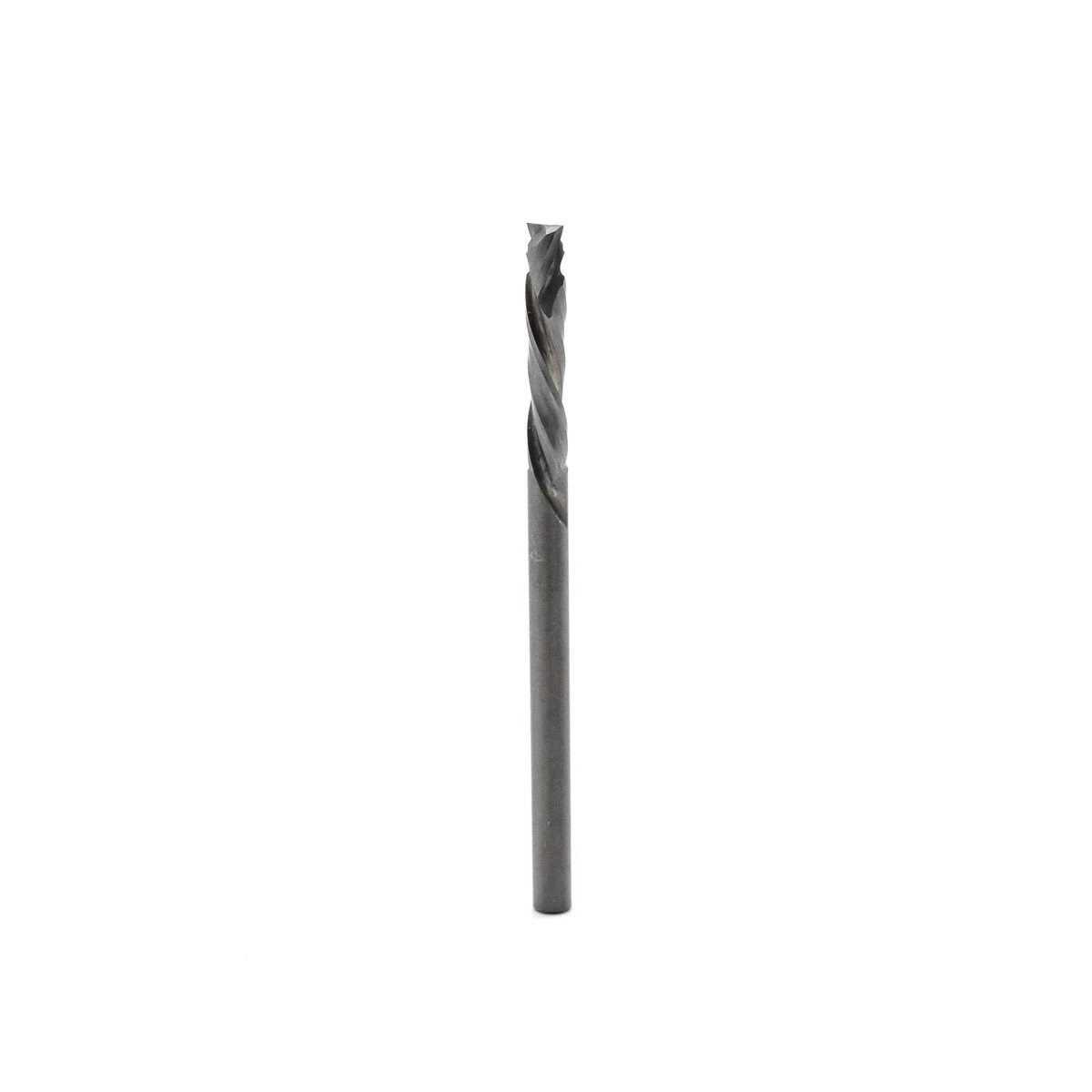 The up and down cut action of these compression CNC bits cuts from base up and the surface down ensuring that you have a perfectly clean edge. A compression cutter starts with an up-cut component usually the length of the diameter. For example, a 3mm bit has a 3mm up cut component and the rest to down cut. To achieve the full benefit of the cutter, your first plunge must go below that length of 3mm or more.